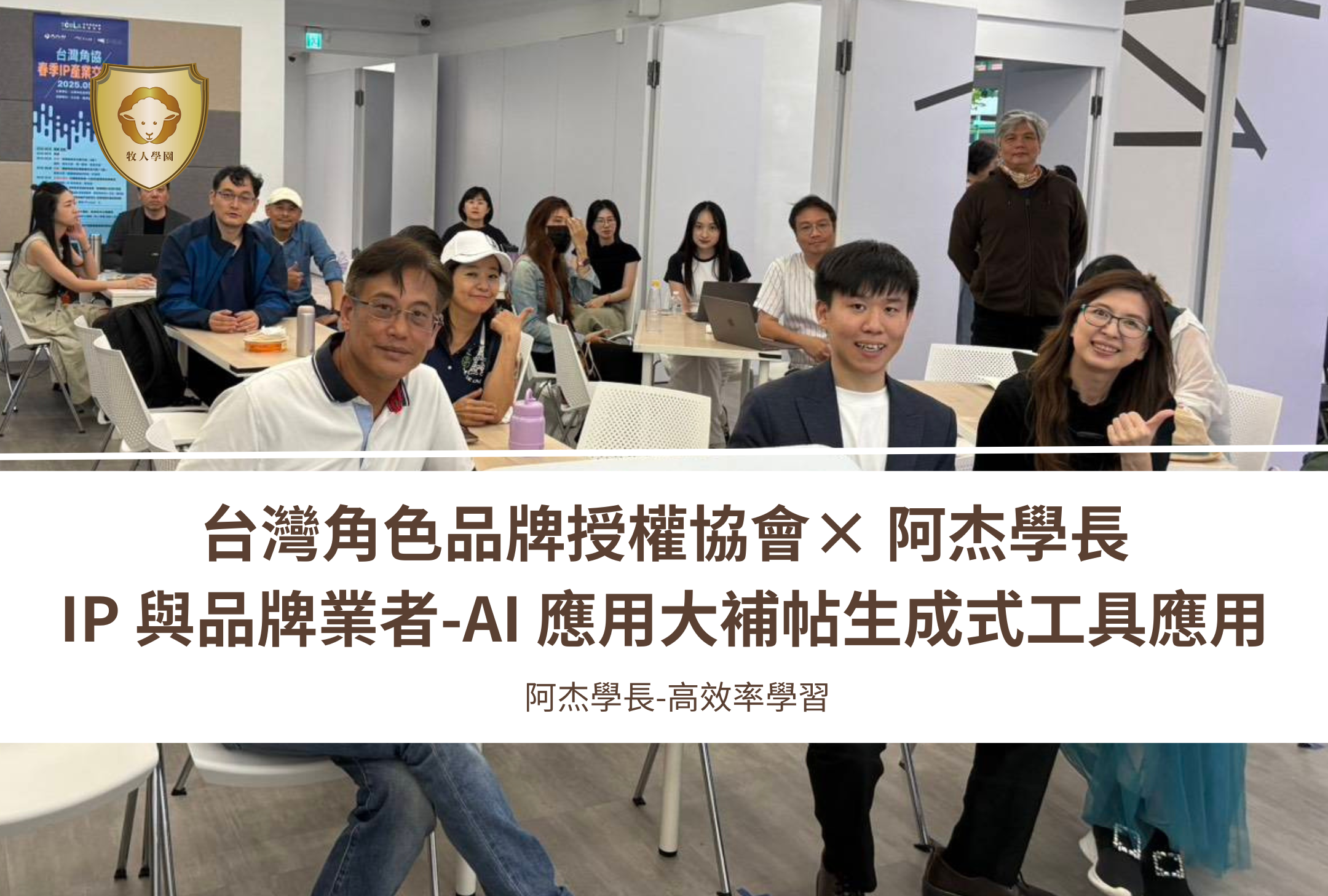 本次由 台灣角色品牌授權協會 主辦的《AI 應用大補帖:生成式 AI 工具應用》,邀請企業與產業 AI 講師 阿杰學長 授課,專為 對 IP 設計、角色經營與品牌授權有興趣的廠商 規劃,協助業者以最短時間,掌握生成式 AI 在圖像、影音與行銷素材製作上的實戰應用。