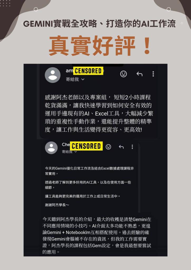 透過本次「GEMINI實戰全攻略」課程,學員不僅學會如何操作AI工具,更重要的是建立了一套可實際應用於工作的AI流程,能夠有效提升資料查證速度、優化內容品質,並減少重複性作業時間。從資訊蒐集、整理到報告產出,全面導入AI輔助,讓工作效率與專業度同步升級,真正達到AI賦能工作的實質成果。