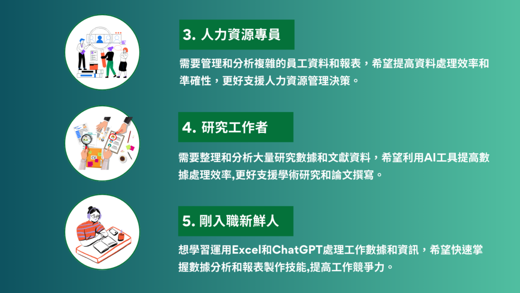 本課程旨在帶領學員深入了解生成式 AI 工具如何應用於數據分析,降低學習與操作的難度,全面提升工作效率與成果表現。透過本課程,學員將掌握實用的技術與策略,為職場競爭力注入全新動能。
