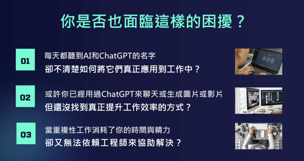 ChatGPT 問世後,全世界掀起了一股前所未有的 AI 學習潮流,無論是在商業、教育、行銷、甚至日常生活中,AI 的應用已經深入我們的每一個角落。但你在使用ChatGPT時,是不是遇到以下問題呢?