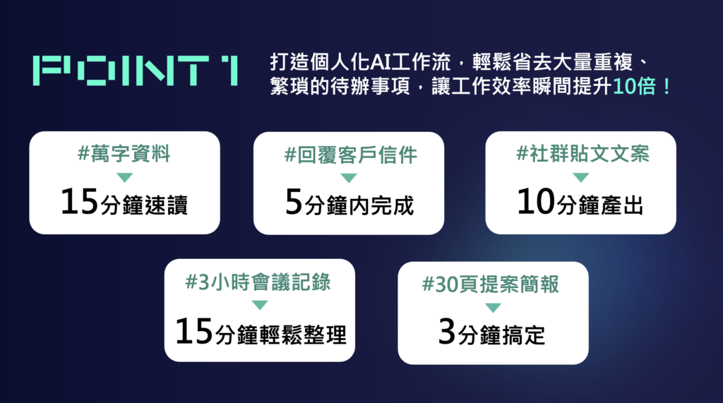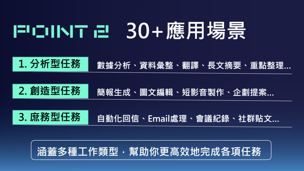 教導學員如何使用ChatGPT自動生成回覆的郵件內容、整理會議紀錄、並利用AI文案優化技巧,提升文案的可讀性和吸引力等應用,節省工作時間。