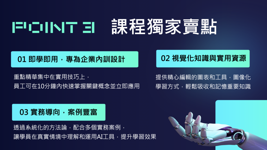 使學員能理解AI在職場上的應用可能帶來的風險,學習如何有效應對這些挑戰,並讓學員對AI的未來趨勢和創新發展有更深的認識與前瞻性。