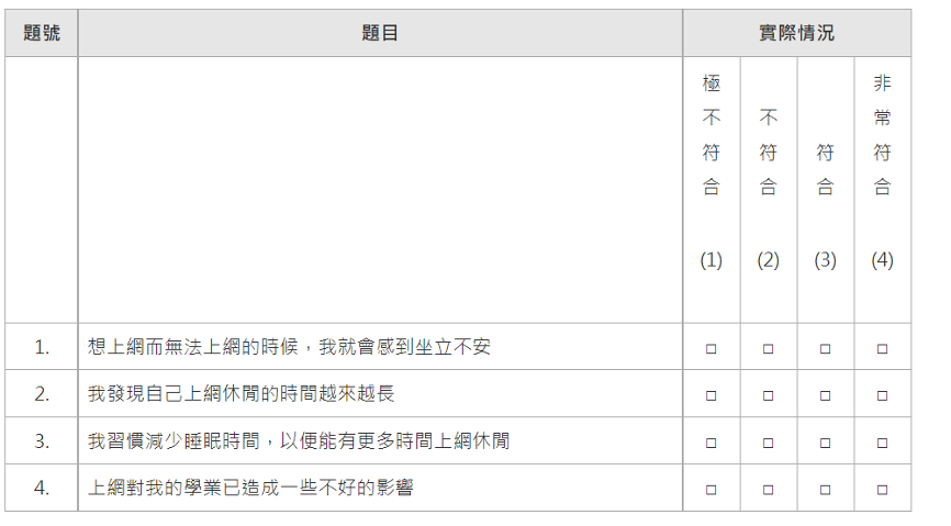 想知道自己有沒有網路成癮的傾向,可以利用下表自我檢測