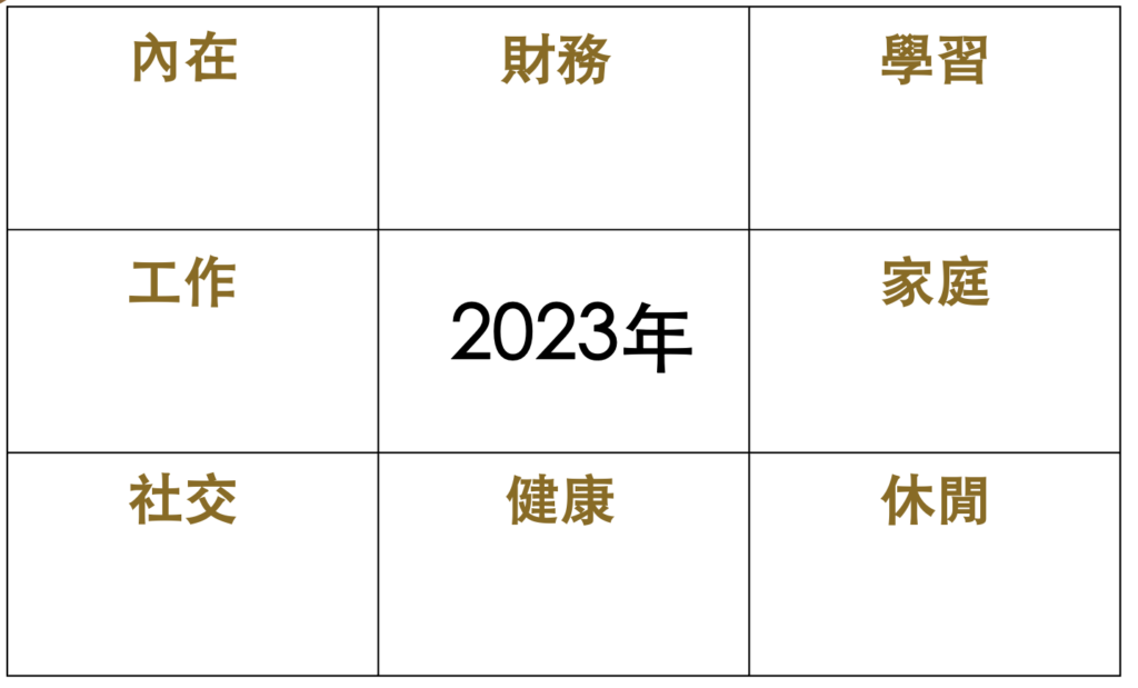 以「年目標」來說,8個格子可包含學習、家庭、休閒、健康、社交、工作、内在、財務。 當然這8個目標,大家可以根據自己的願景或理想自行調整,但建議它們相互之間都能夠互相呼應、扶持。